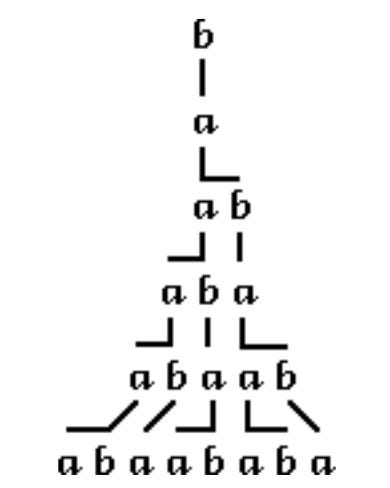 As perhaps the most idiosyncratic and recognizable voice in process-based composition to date, Poppe’s music plays overly nice with music theory. Since the early nineties, he has primarily modeled his organizational logic using a 1968 developmental algorithm written by Aristid Lindenmayer called L-Systems, designed for simulating the fractal and symmetrical growth of plants. In its most base form, the theory involves a simple formula of simultaneous replacement: given the terms a and b, and the rules a → ab and b → a, the following derivation is yielded through the first six strings (this example from Prusinkiewicz and Lindenmayer’s The Algorithmic Beauty of Plants):